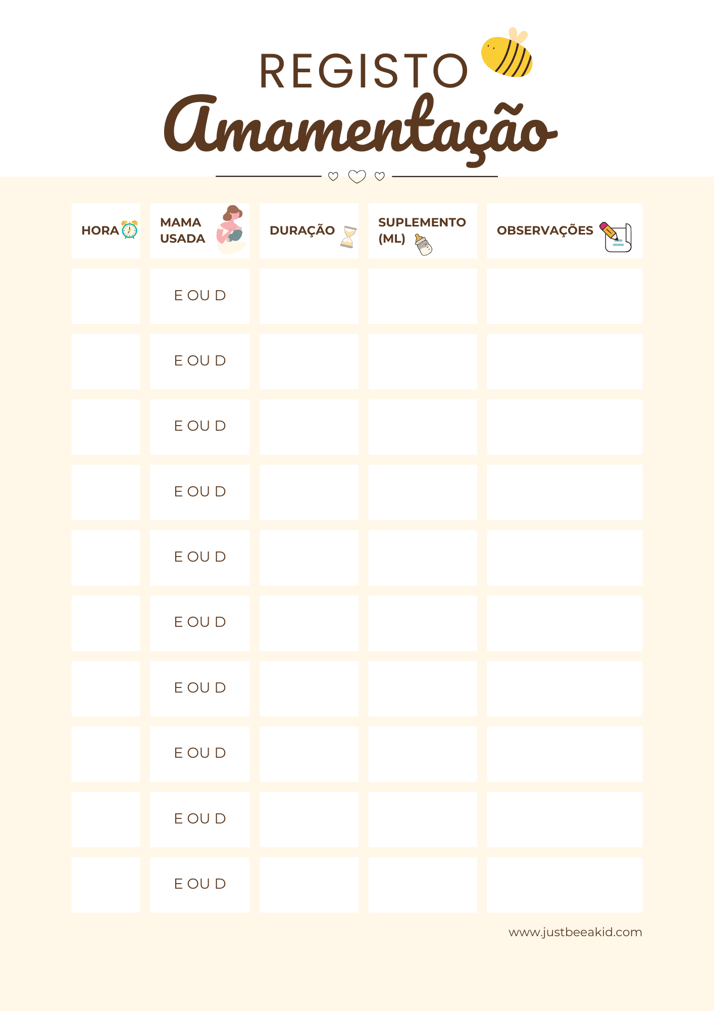 O Registo Diário de Amamentação em PDF da Just Bee a Kid foi criado para ajudar as mães a acompanhar de forma simples e organizada todas as mamadas do bebé. Ideal para o período do pós-parto, permite registar horários, duração e observações de forma prática e tranquila.